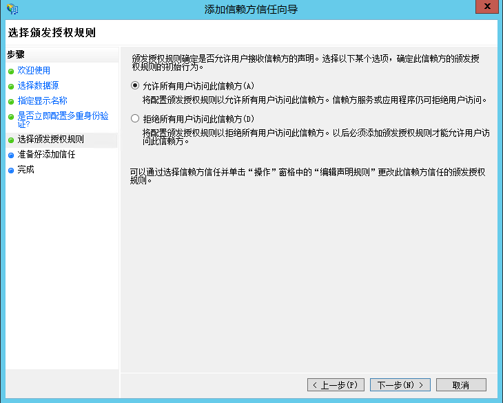 7.       选择 允许所有用户访问此信赖方, 点击下一步