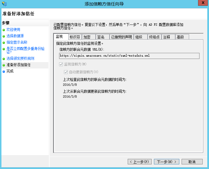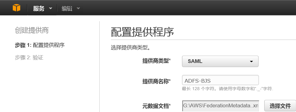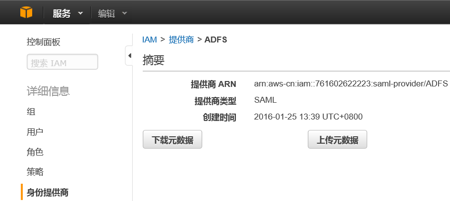 2.       在IAM服务中, 点击身份提供商, 选择SAML, 导入从ADFS服务器上导出的SAML Metadata