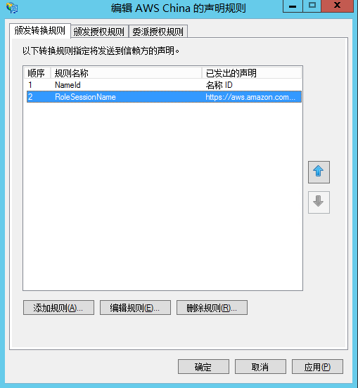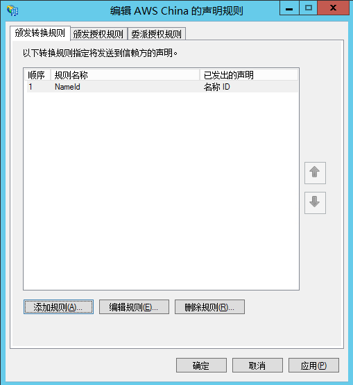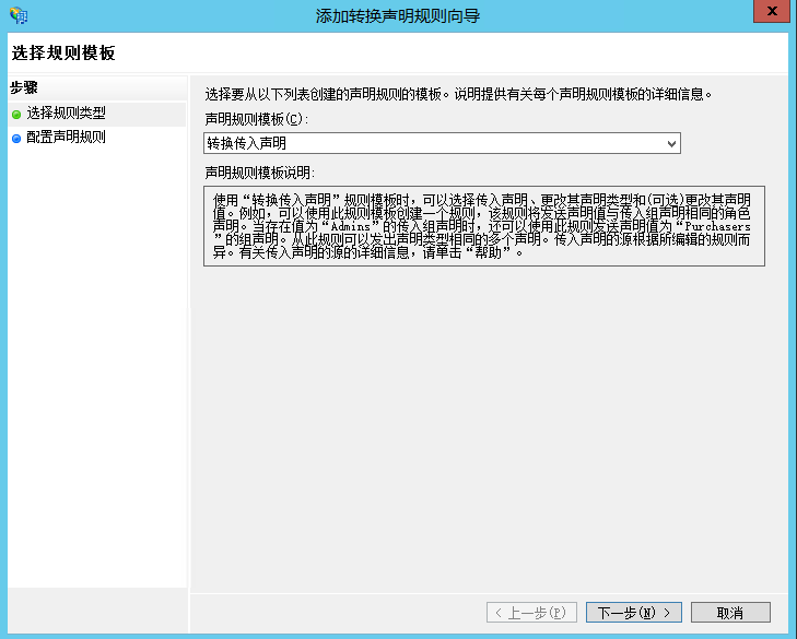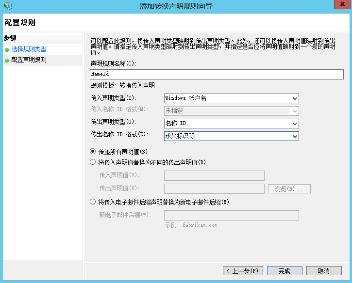 3.       声明规则名称使用 NameId, 传入声明类型 选择 Windows帐户名, 传出声明类型 选择 名称ID, 传出名称ID格式 选择 永久标识符, 点击完成