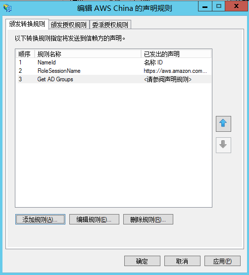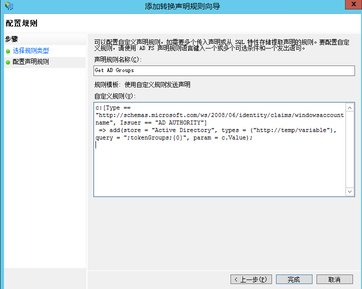 9.       声明规则名称输入 Get AD Groups, 自定义规则输入以下文本 (这一步用来取出登录用户所在的AD用户组, 并将其传入到临时声明 http://temp/variable中), 点击完成