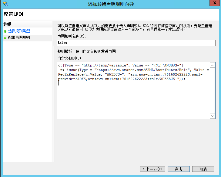 12.    声明规则名称 输入 Roles, 自定义规则中输入以下文本 (这部分主要是用来映射AD中的用户组 和 AWS中的角色之间的对应关系, 其中红色部分需要根据我们前面所建的AD用户组名称 和 身份提供商的ARN和角色的ARN调整), 点击完成