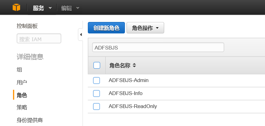 4.       新建IAM 角色ADFSBJS-Admin和ADFSBJS-ReadOnly [注意选择 授予 SAML 提供商 Web 单点登录 (Web SSO) 访问权限, 这两个角色会和活动目录中的新建的用户组AWSBJS-Admin和AWSBJS-ReadOnly对应]
