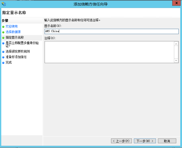 5.       在 显示名称 中输入AWS China, 然后点击下一步
