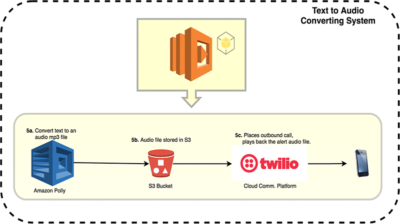 然后,它调用 Twilio API 进行电话呼叫,并播放来自 S3 存储桶的事件通知音频文件。
