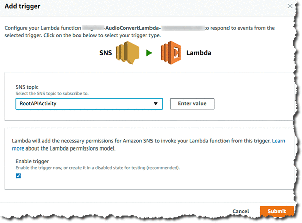 - 在触发器框中,选择 SNS,并选择您希望用于电话呼叫的“事件检测和通知”系统的 SNS 主题。选择 Submit。