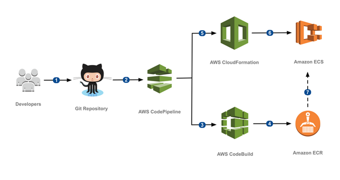 - Pipeline的Deploy阶段,AWS CodePipeline触发AWS CloudFormation,其定义了Amazon ECS的Task definition和service