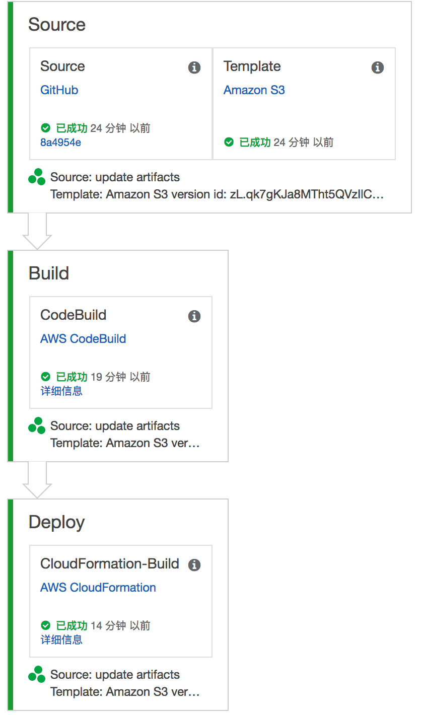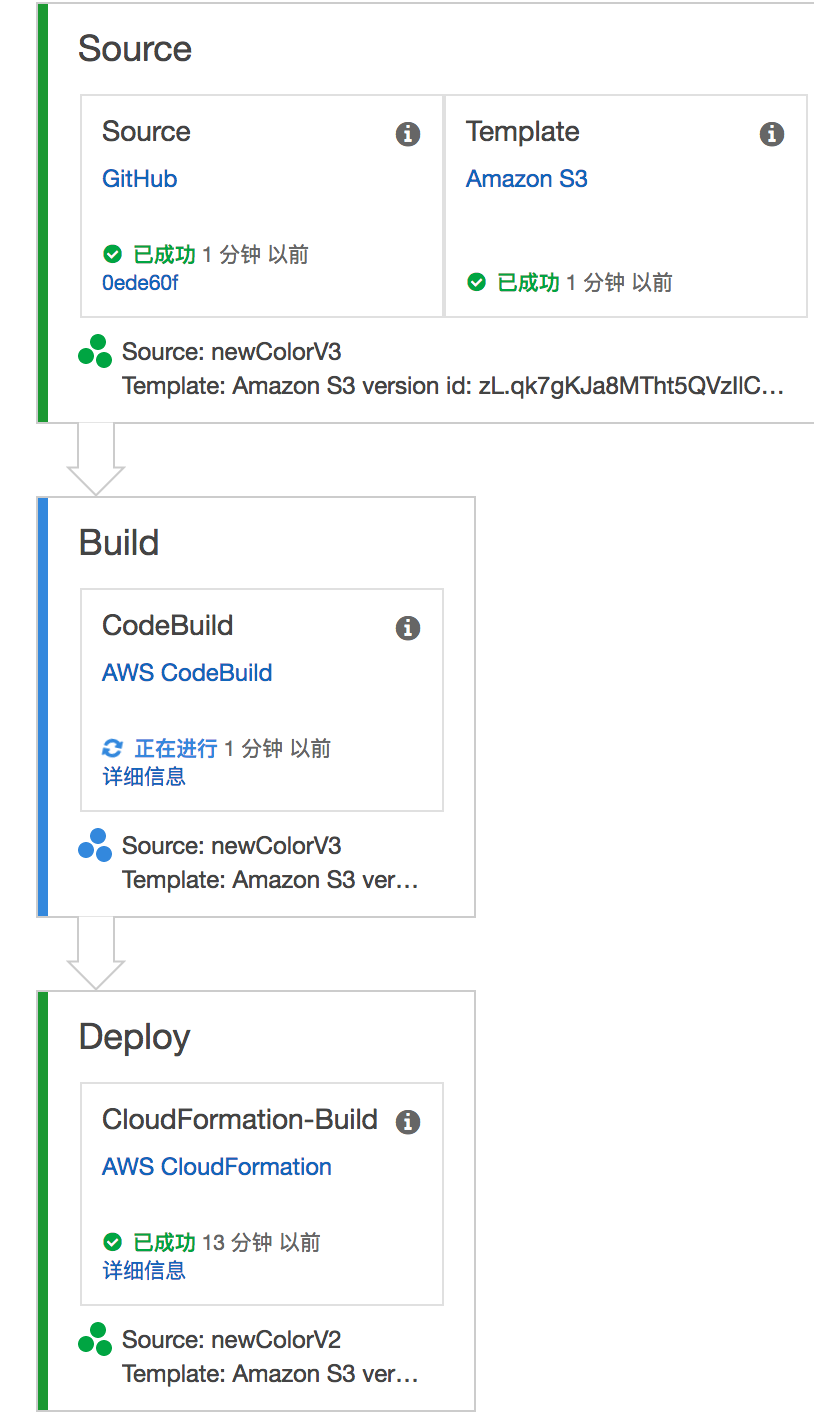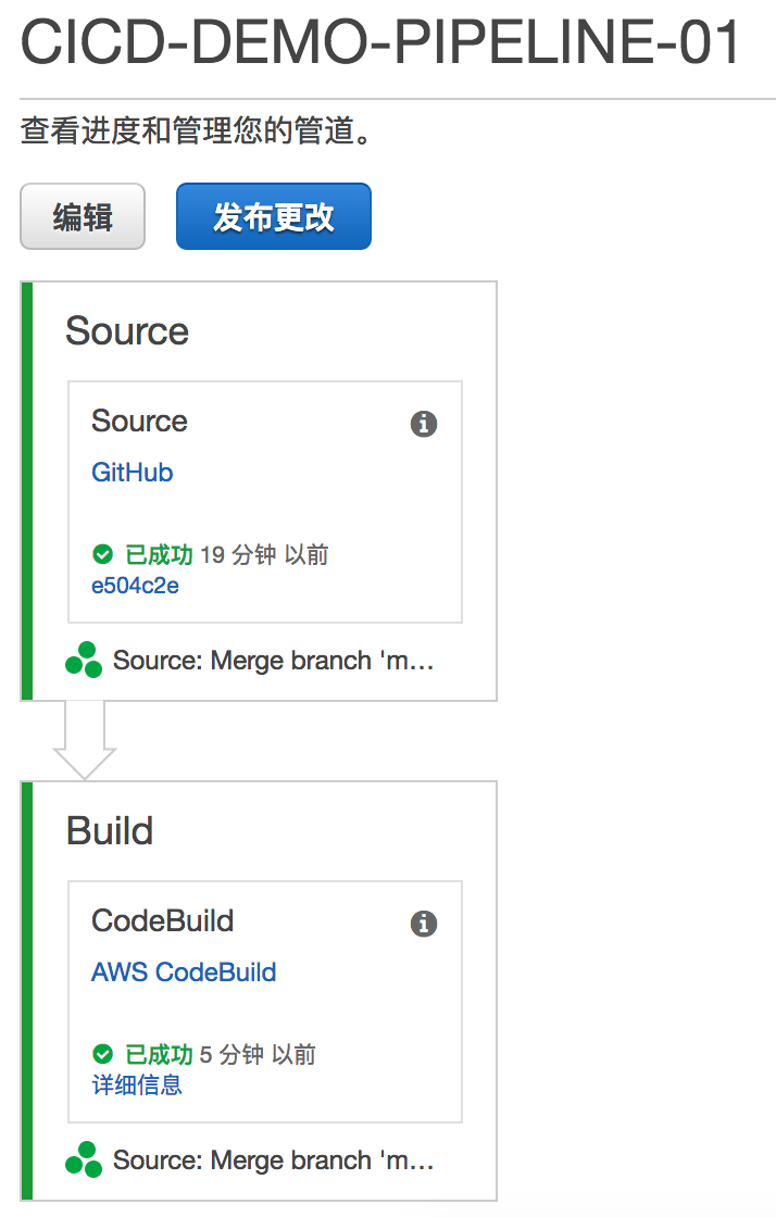 AWS CodePipeline创建后的展示图是这样的,串起了整个CICD流程