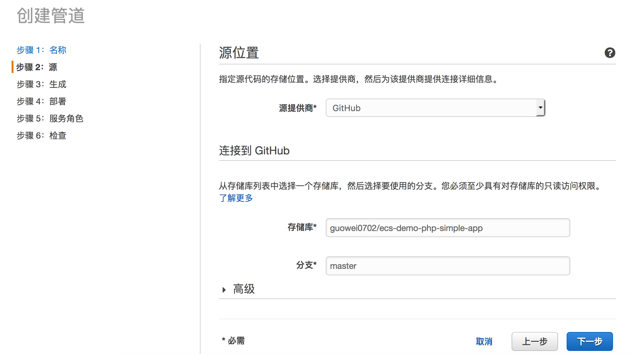 点击连接到GitHub来授权访问权,来允许AWS CodePipeline从GitHub上获取软件工程源内容,认证后选择GitHub上软件工程所在位置和分支