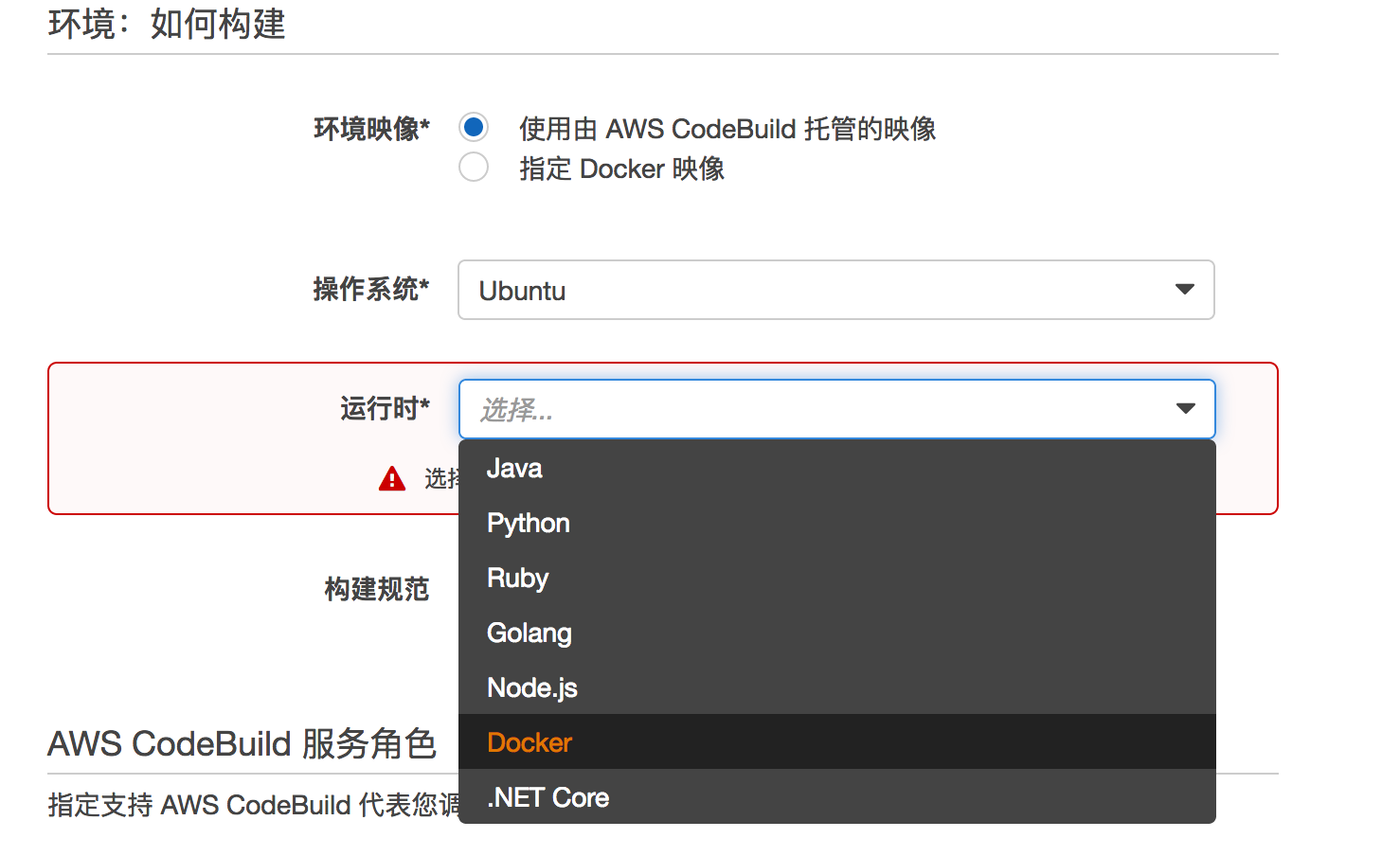 选择AWS CodeBuild托管的镜像,支持Ubuntu系统,运行时支持包括Java,Python,Go语言,Node.js,Docker在内的众多选择,此次方案使用Docker。