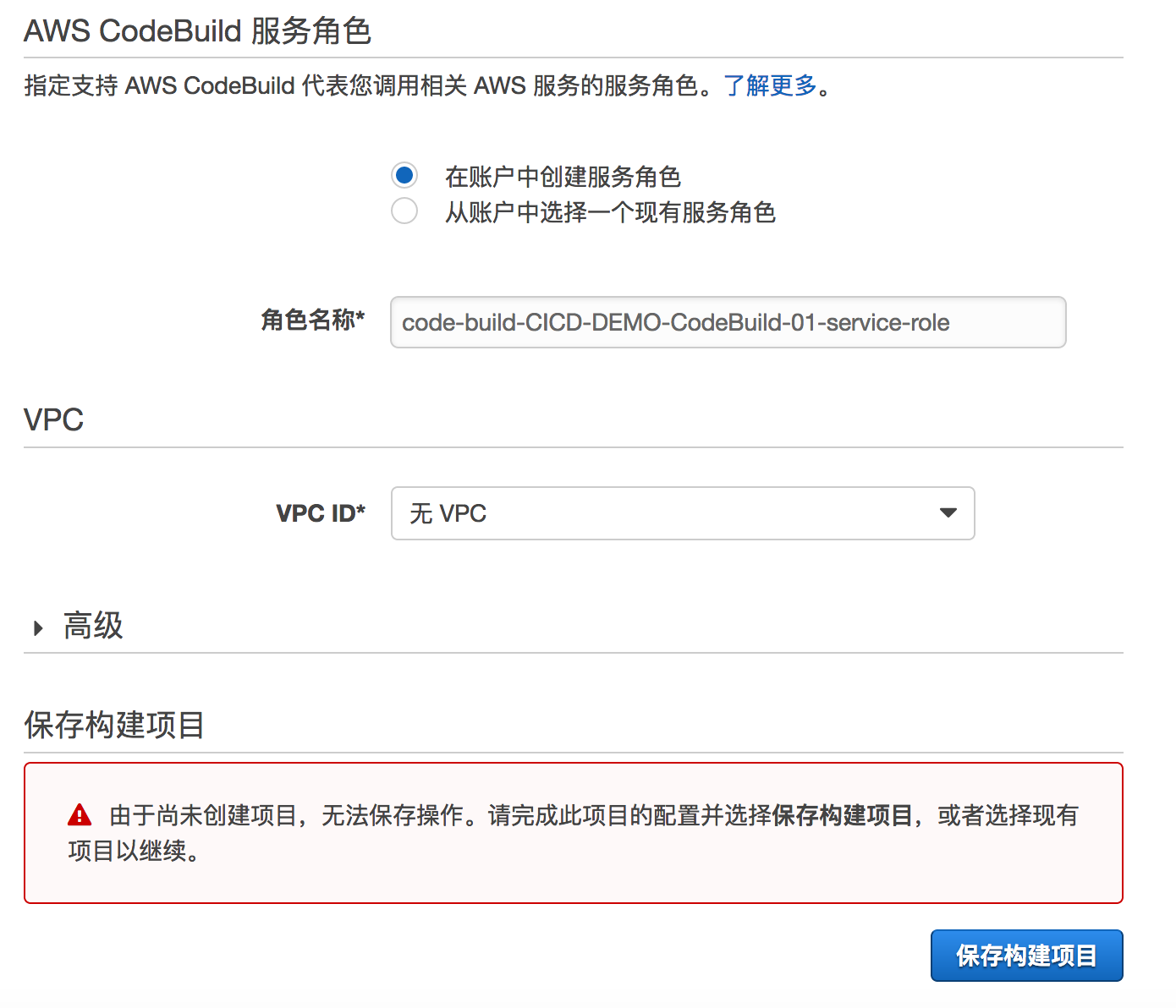 *默认创建的Role不具备对ECR的权限,需要在保存构建项目后,到IAM找到新创建的Role,编辑添加对ECR的权限否则后面Pipeline执行到Build时会报错。