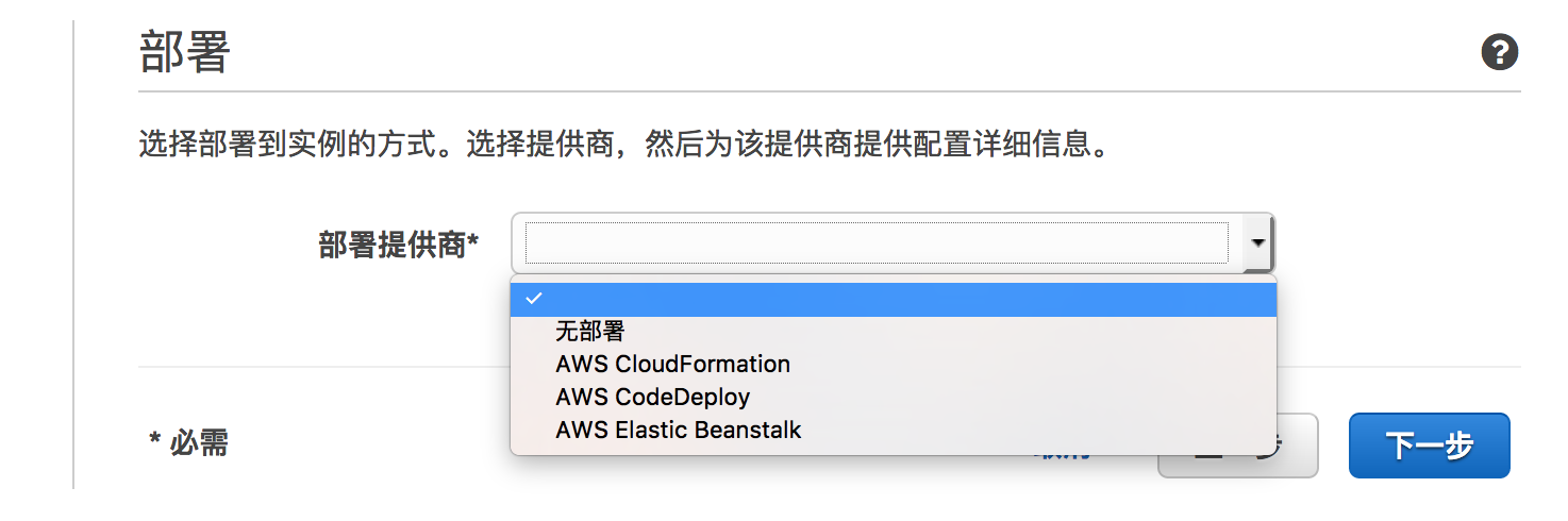 这里暂时选择无部署,等Pipeline创建好后,编辑引入Deploy的CloudFormation模版源,再进行配置。