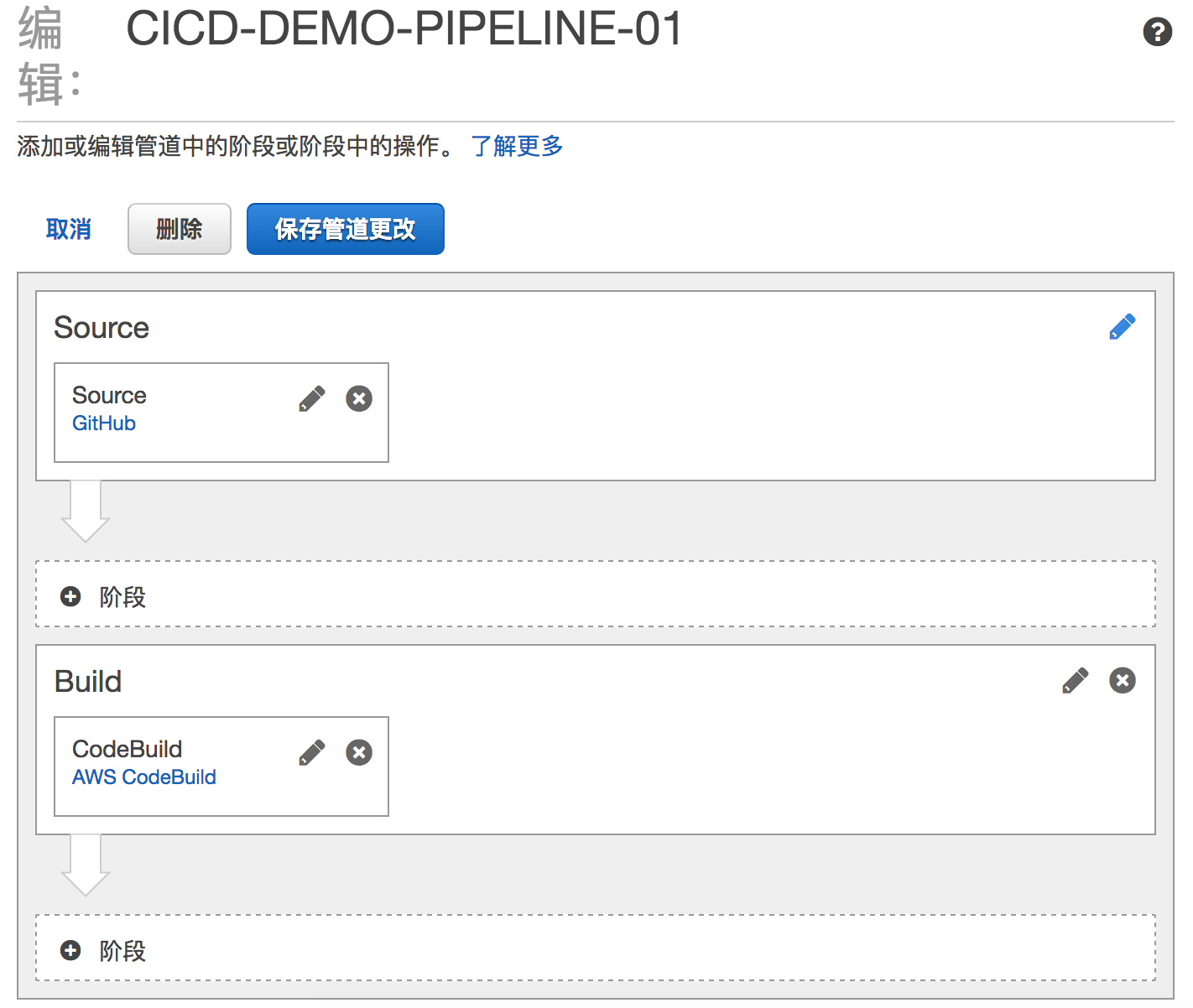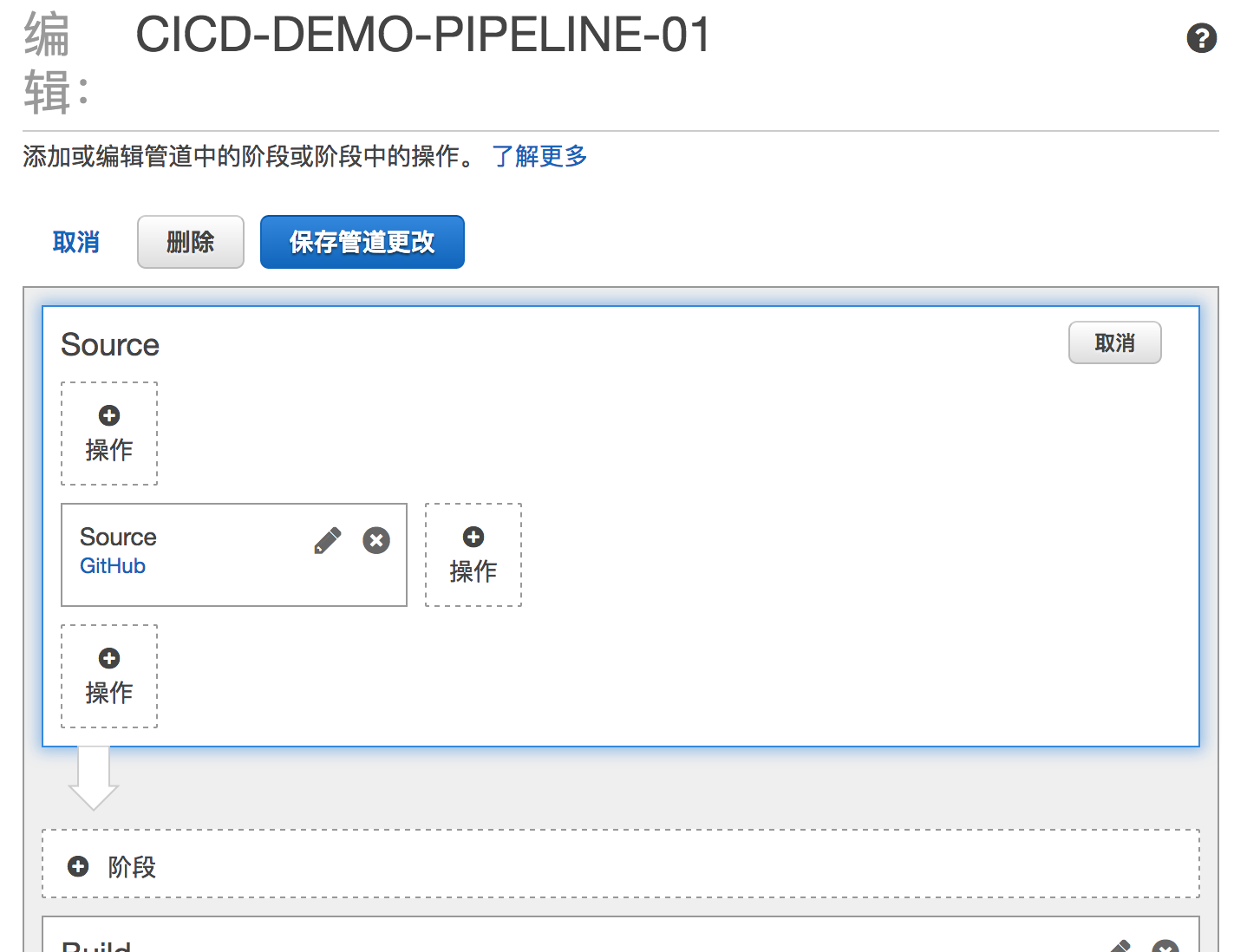 可以看到AWS CodePipeline的编辑界面在南北纵向和东西横向都可以添加