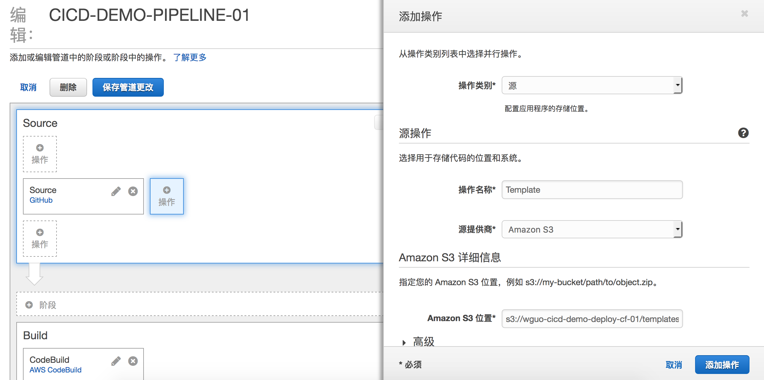 在GitHub这个Source右侧,点击添加操作,选择源,操作名称Template,选择S3,输入创建好的S3桶的地址