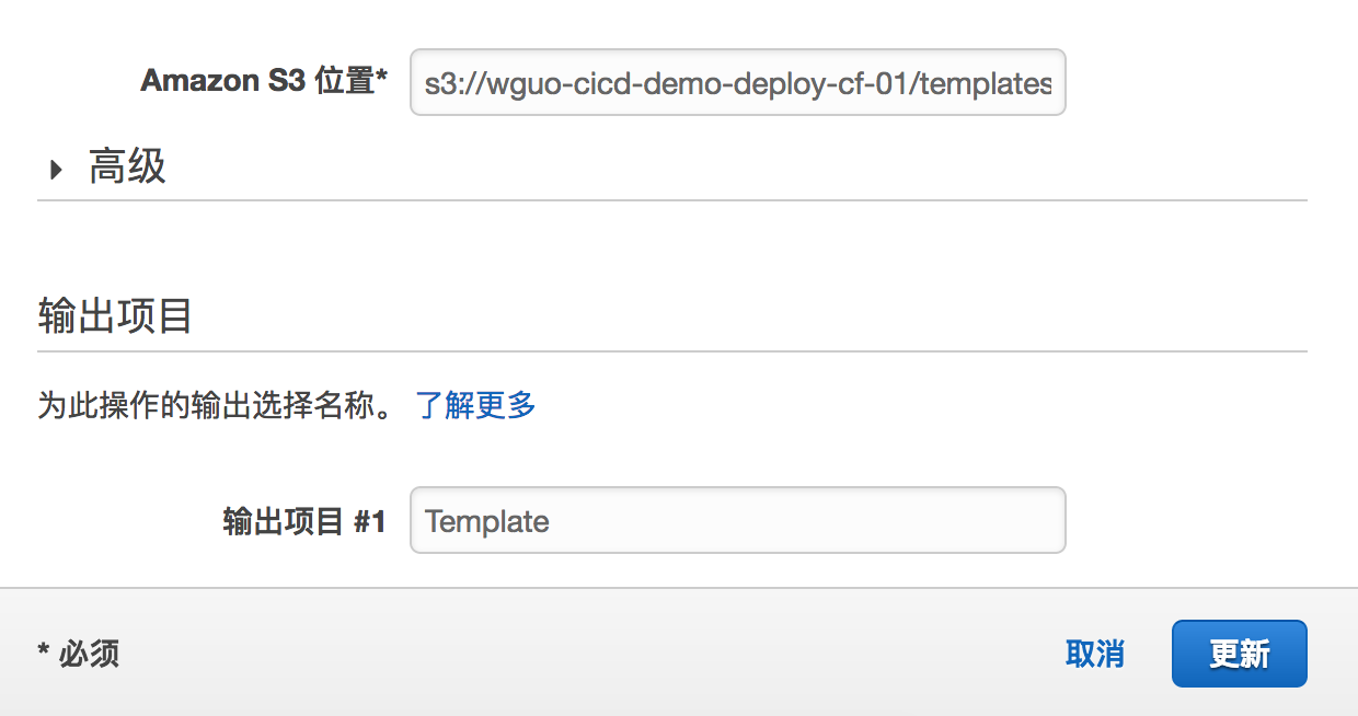 Pipeline中各阶段的传递需要制定南北向的输入输出,即Source阶段S3源的输出Template,在Deploy阶段用输入Template来衔接。