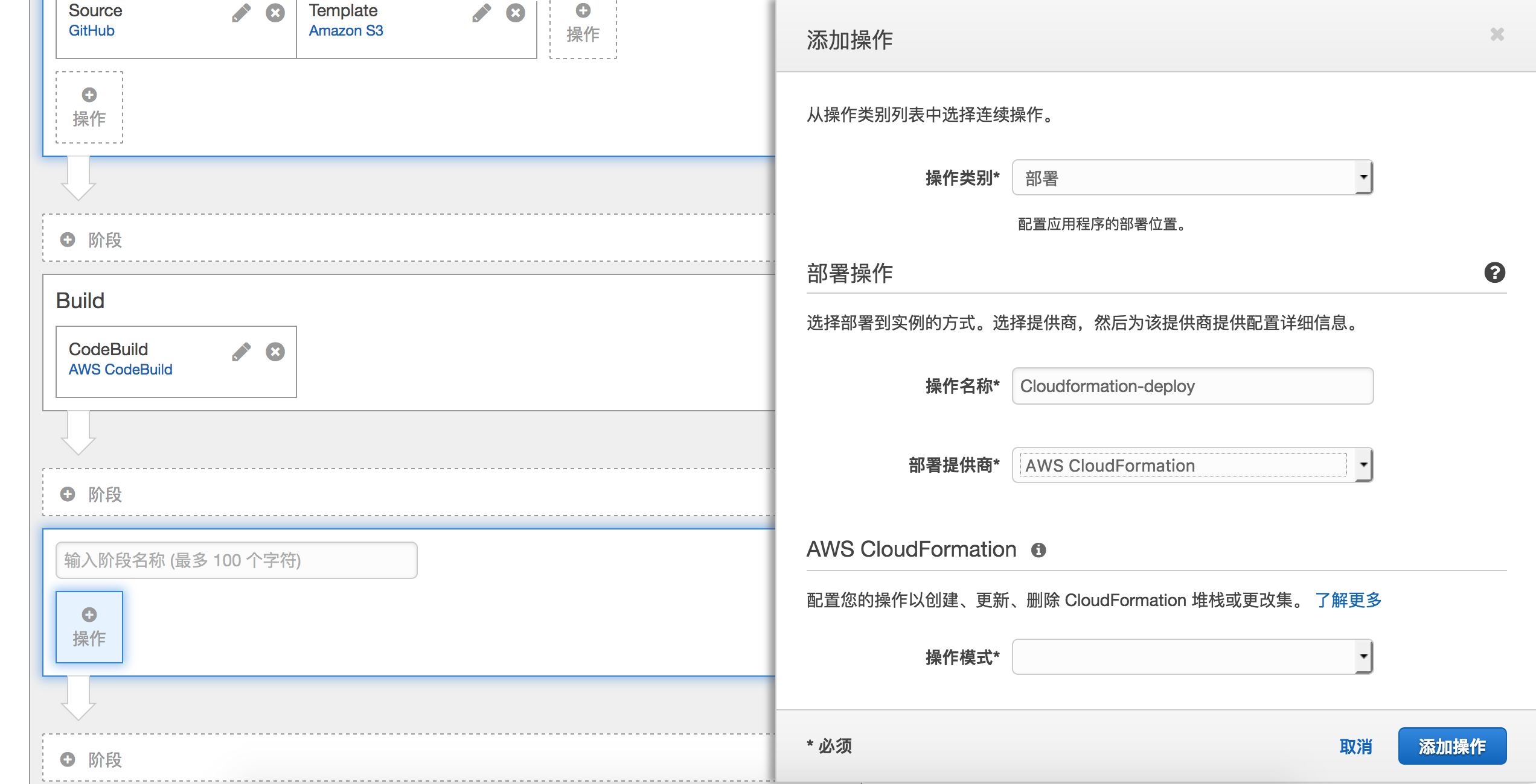 点击Build阶段下面的添加阶段,画面右侧选择部署,选择AWS CloudFormation