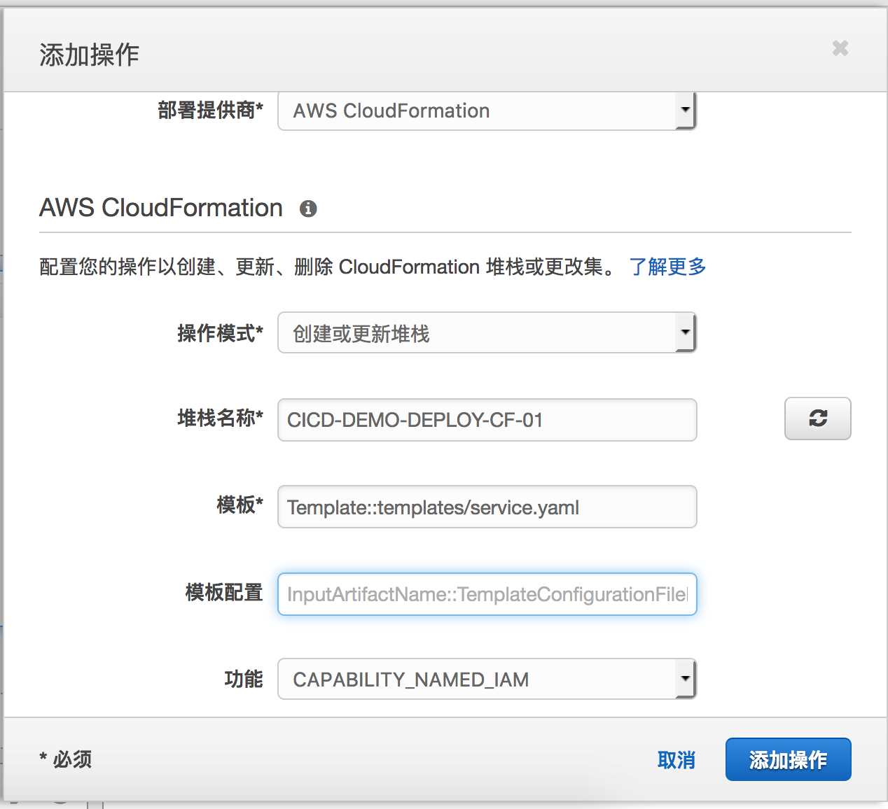 操作模式选择创建或更新堆栈,输入创建的堆栈名称,模版这里输入Template::templates/service.yaml,也就是对应的输入是S3源桶中templates.zip里的service.yaml文件。功能选择CAPABILITY_NAMED_IAM。