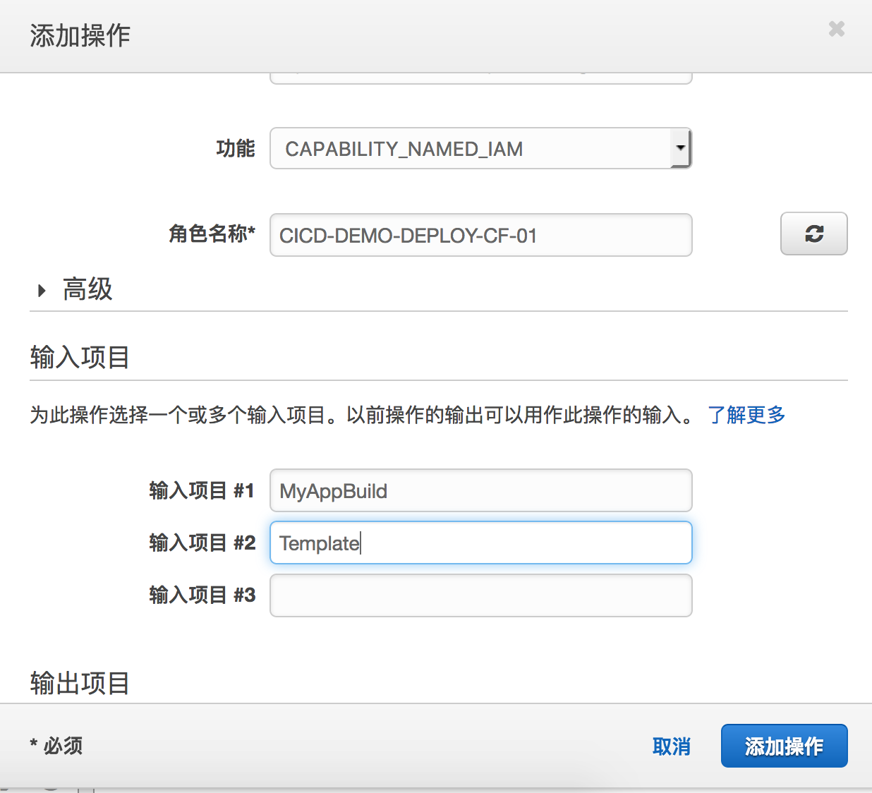 输入项目这里输入Build阶段和S3模版源的输出。