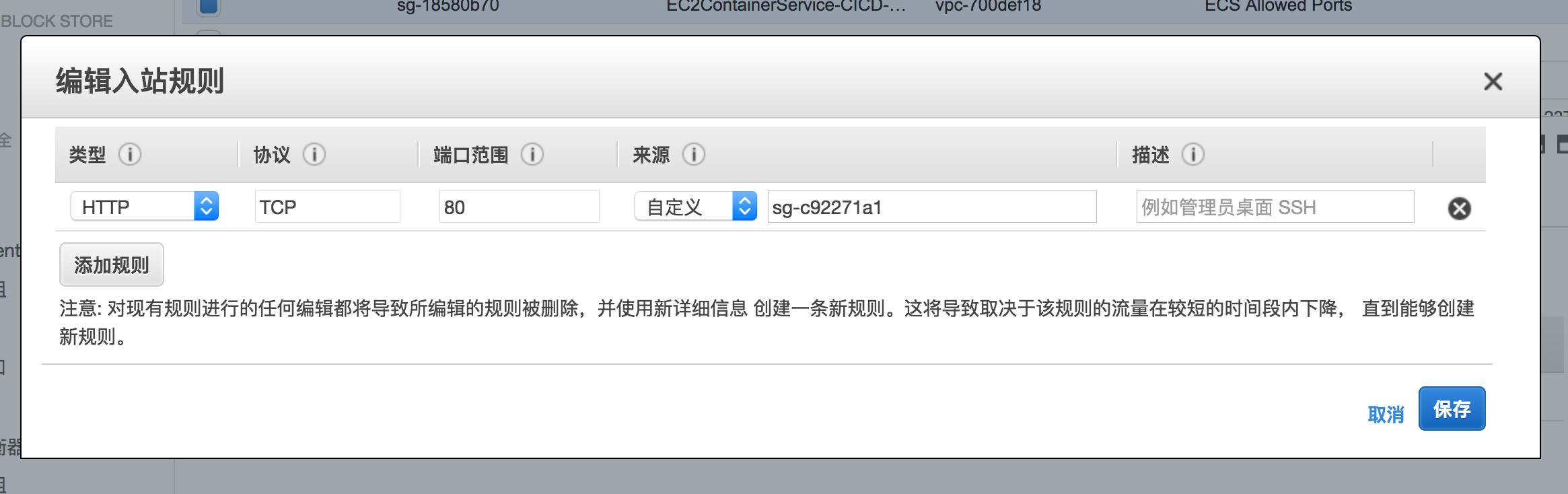 修改ECS宿主机集群的安全组,inbound源设置为建好的应用负载均衡器的安全组ID
