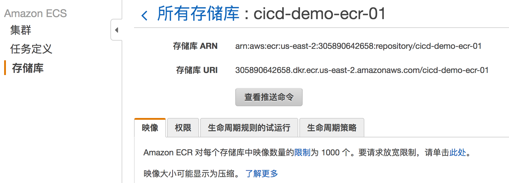 ECS界面下,创建存储库,创建好后如下