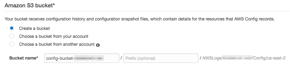 4. 选择用于存储配置历史记录和快照的 Amazon S3 存储桶。我们会创建一个新的 Amazon S3 存储桶。AWS-config-03