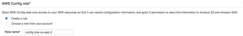 6. 除非您已经有要使用的角色,否则请在 AWS Config role (AWS Config 角色) 下选择 Create a role (创建角色)。我们使用系统自动推荐的角色名称。AWS-config-06
