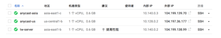 首先,需要前往到 GCE 后台,建立至少两个不同地区的实例,我专门为测试 Anycast 功能建立了两个新的实例: