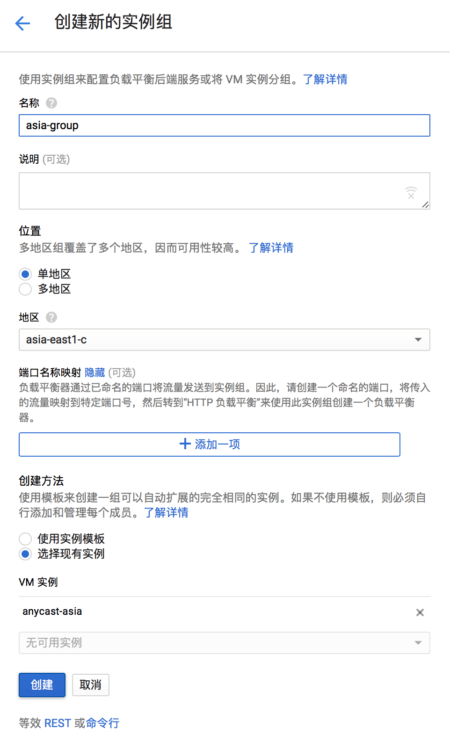 我只给每个地区建立了一个实例,所以我只需要选择 “单地区(Single-zone)”。每个地区都需要建立一个实例组,所以一共需要建立两个(或更多的)实例组。我配置了两个实例组,分别叫 asia-group 和 us-group。
