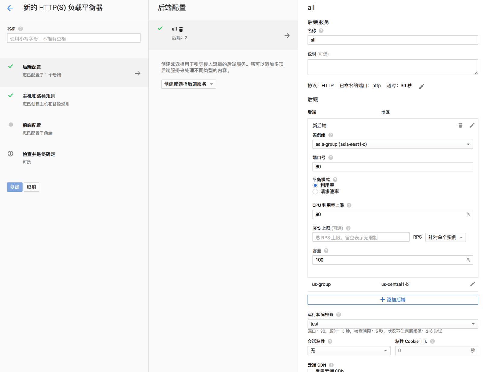 在负载均衡的配置界面,把这两个实例组都添加到 “后端” 中。