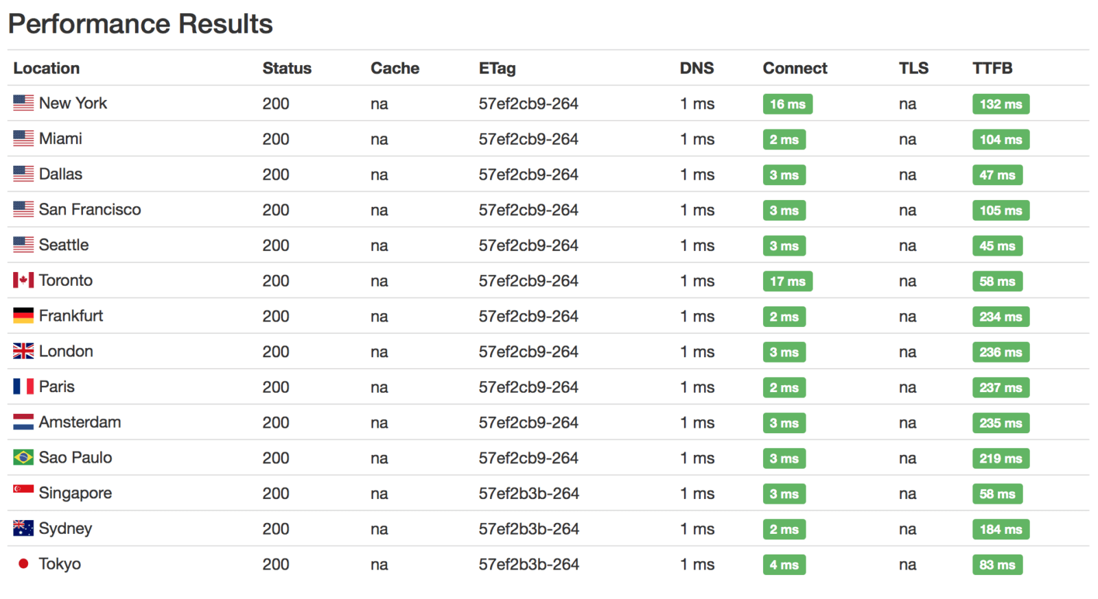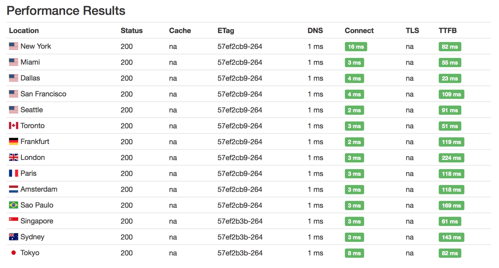 多次运行测试确保有缓存之后,发现速度似乎并没有太多明显的提升。能够明显的看出改善的是:巴黎和阿姆斯特丹的 TTFB 延迟从 200ms 减少到了 100ms,然而还是不尽人意。可能的原因是:Google 并没有将内容缓存到离访客最近的边缘节点上,而是别的节点上。