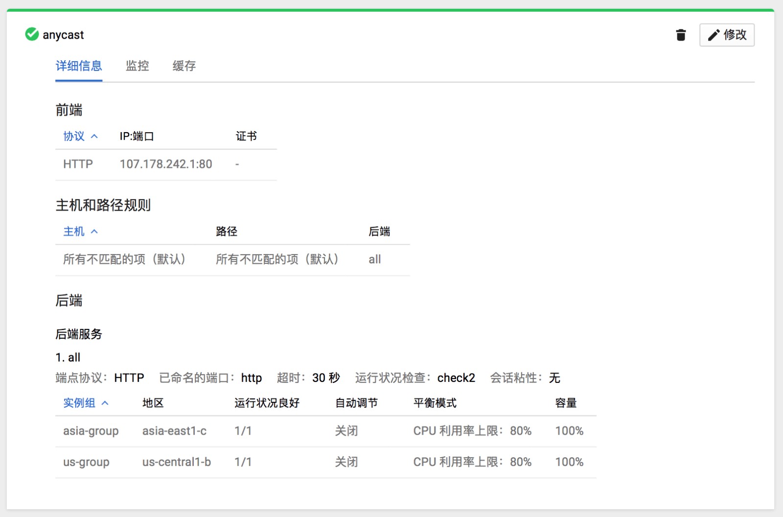 创建成功后,可以看到如下界面,其中的 IP 地址就是 Anycast IP 了。