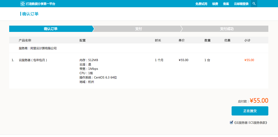 确定后,可以按需要去配置服务器,建议最初可以选择最低配置,因为后续升级也非常容易。选择 CPU,内存,带宽,不同的配置价格不同。你还要选择 地域 ,也就是云服务器所在的地方,目前只有 青岛 与 杭州。再去选择操作系统,这篇文章所做的测试用的是 CentOS 6.3 64 位。需要的话可以再增加一块数据盘,默认会带一个系统盘,一共 20 G ,足够我们测试用了。
