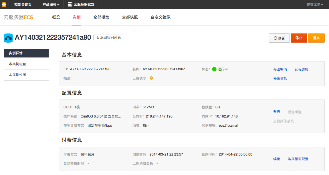 在这个界面,你还可以 停止 或 重启 去服务器。也可以找到你的服务器的公众的 IP 地址。我购买的这台服务器地址是218.244.198.199,使用这个地址配合 root 用户和密码,你可以使用工具登录到服务器,对它进行远程管理,比如安装软件,修改设置,重启服务等等。