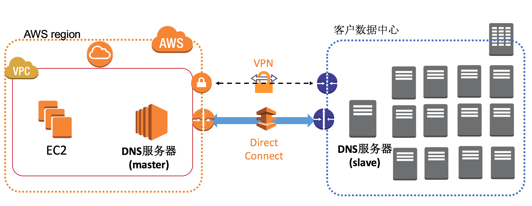 常见的应用场景是在混合IT架构下,客户数据中心通过VPN或是Direct Connect专线连接到AWS上的VPC,在VPC中配置1台DNS服务器,在客户数据中心也配置1台DNS服务器,服务器的主从角色客户可自行定义。通过多台DNS服务器为不同位置的客户端提供DNS服务,即能保证服务的高可用,又能就近提供服务,减少DNS查询延迟。