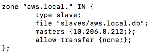 从服务器的type类型为slave,file参数对应的域配置文件会自动根据从主DNS服务器接收到的更新来进行创建和更新,masters指定aws.local域的主域名服务器,最后一个参数allow-transfer禁用了区域传送。