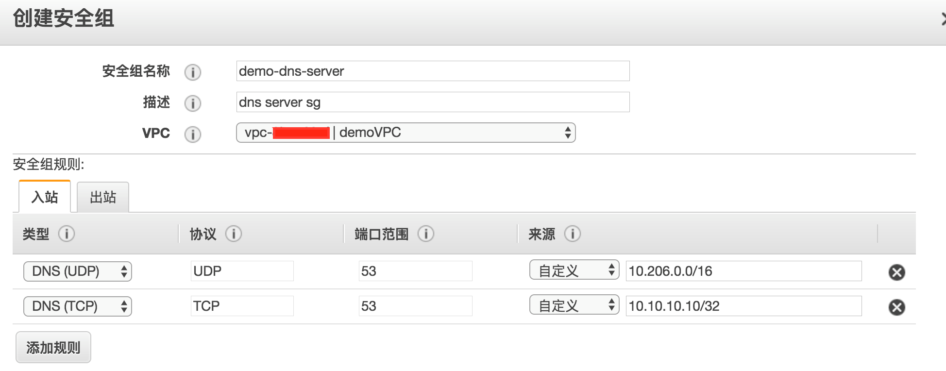 创建EC2实例时需要指定安全组来开放服务端口,DNS服务通过UDP 53端口提供DNS查询相应,通过TCP 53端口提供区域传送。因此,安全组队VPC网段开放UDP 53端口,对客户数据中心的DNS服务器开放TCP 53端口,如下图所示: