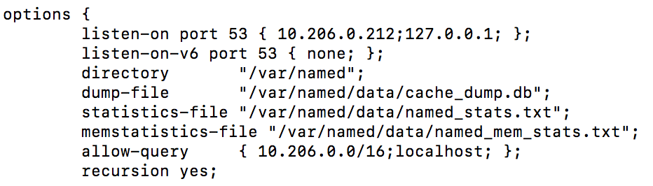 allow-query缺省配置为localhost,即只允许DNS服务器所在的EC2实例对自己进行DNS查询,添加VPC的网段可允许来自VPC内部的主机进行DNS查询。注:也可将此参数设置为0.0.0.0/0,因为前面安全组设置里只允许了VPC内的IP访问UDP 53端口。
