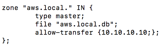 此外,还需要增加对aws.local这个域的定义,在/etc/named.conf中增加以下内容,allow-transfer指定了只允许从DNS服务器进行区域传送,限定允许区域传送的范围颗可提高DNS服务的安全性: