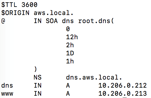 上述配置说明aws.local域的具体解析配置在文件/var/named/aws.local.db 里,其内容如下,在这个示例配置中,定义了两条A记录,分别是dns.aws.local对应10.206.0.212和www.aws.local对应10.206.0.213
