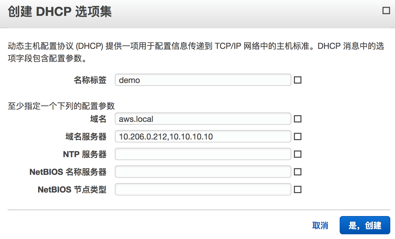 在AWS控制台中选择VPC服务,并在左边的菜单中选择“DHCP选项集”,点击“创建DHCP选项集”按钮,输入以下信息,域名服务器可指定多个DNS服务器,按照顺序第一个为VPC内的DNS服务器,第二个为客户数据中心的DNS服务器: