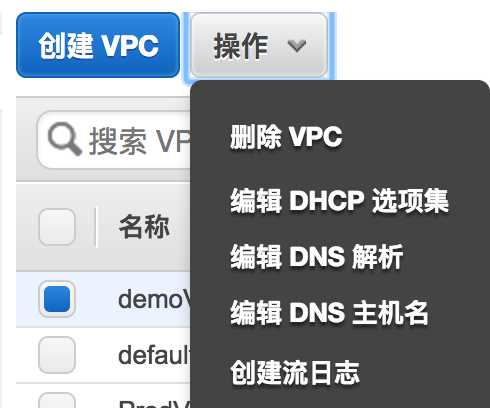 创建好DHCP选项集之后选择左边菜单中“您的VPC”选项,选中要修改的VPC,从“操作”下拉菜单中选择“编辑DHCP选项集”
