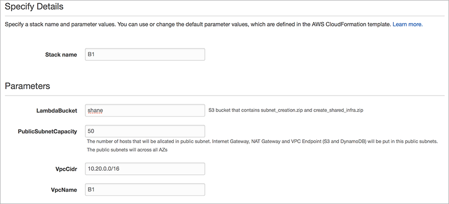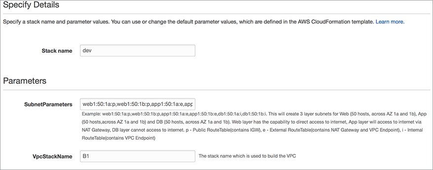 - 输入 SubnetParameters:web1:50:1a:p,web1:50:1b:p,app1:50:1a:e,app1:50:1b:e,db1:50:1a:i,db1:50:1b:i