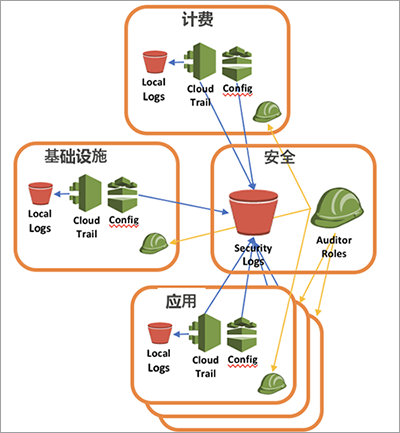 AWS 建议在所有账户内打开 CloudTrail 和 AWS Config 功能。所有日志信息要复制到安全账户内的 S3 存储桶中。建立跨账户访问的 Auditor 角色。