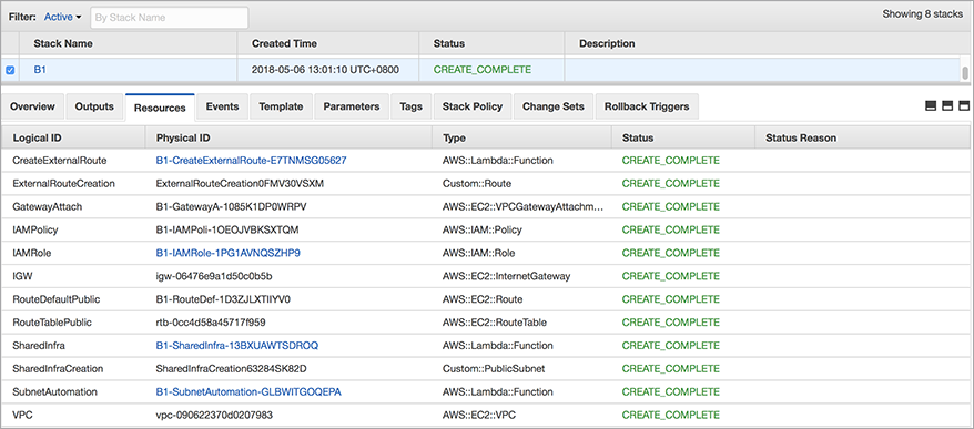 本方案使用2个 CloudFomation 模板, 第一个模板(CreateBaseVpc.json)创建共享资源,例如 VPC、Internet Gateway、公共子网 (Public Subnet) 路由表、在各个可用区内创建公共子网、NAT Gateway、 VPC Endpoint (S3 endpoint和DynamoDB endpoint)和创建外部子网路由表。在这个模板中还创建了3个 Lambda 功能函数: