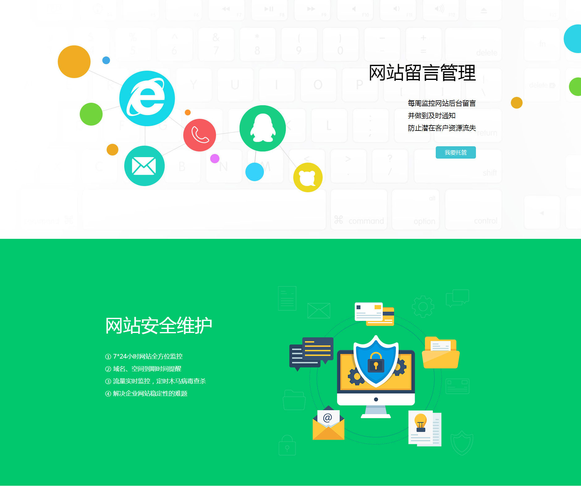 网站托管——是指企业已经有自己的网站,在不想或者没必要请一个专业人员来更新、维护和推广网站的情况下,把网站委托给第三方管理,由第三方代为更新、维护和推广的方式。这种方式可以让企业获得专业的一系列的网络服务,还为企业方节省一个或多个专业技术人员不菲的费用支出,大大降低了企业的运营成本。