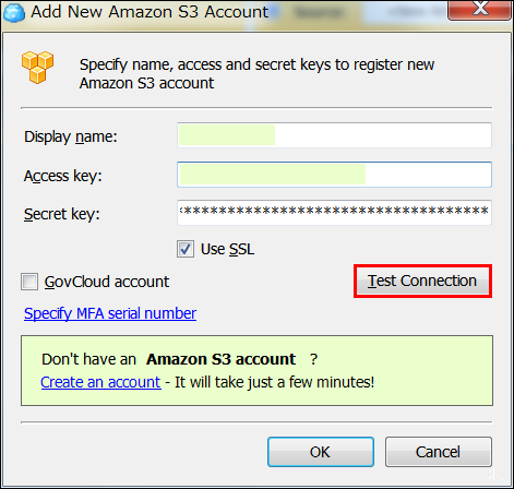 cloudberry122.输入「Display Name」、「Access key」、「Secret key」以后,点击「Test Connection」。