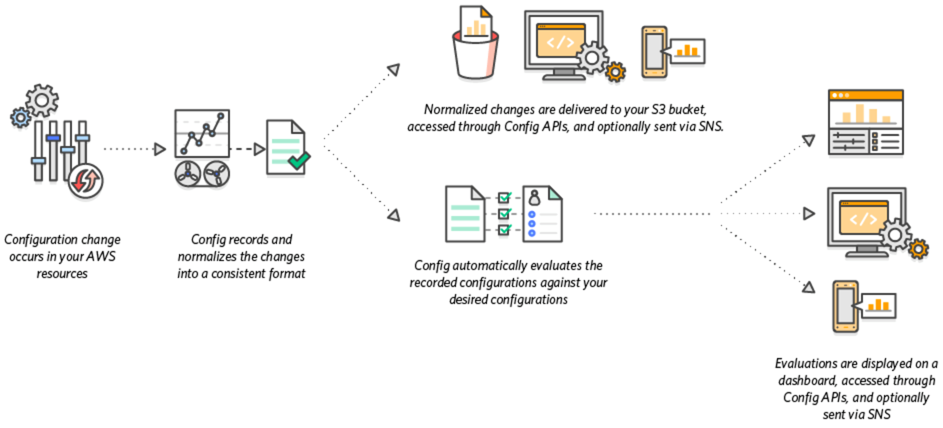 AWS Config 提供的数据可使您持续监控您的资源配置情况,并评估这些配置是否具有潜在的安全弱点。对您的资源配置进行更改,将触发系统发送 Amazon Simple Notification Service (SNS) 通知,这些通知可发送给您的安全团队,以便他们查看通知并采取相应措施。发生潜在的安全事件后,您可以使用 Config 查看资源的配置历史记录并检查您的安全状况。