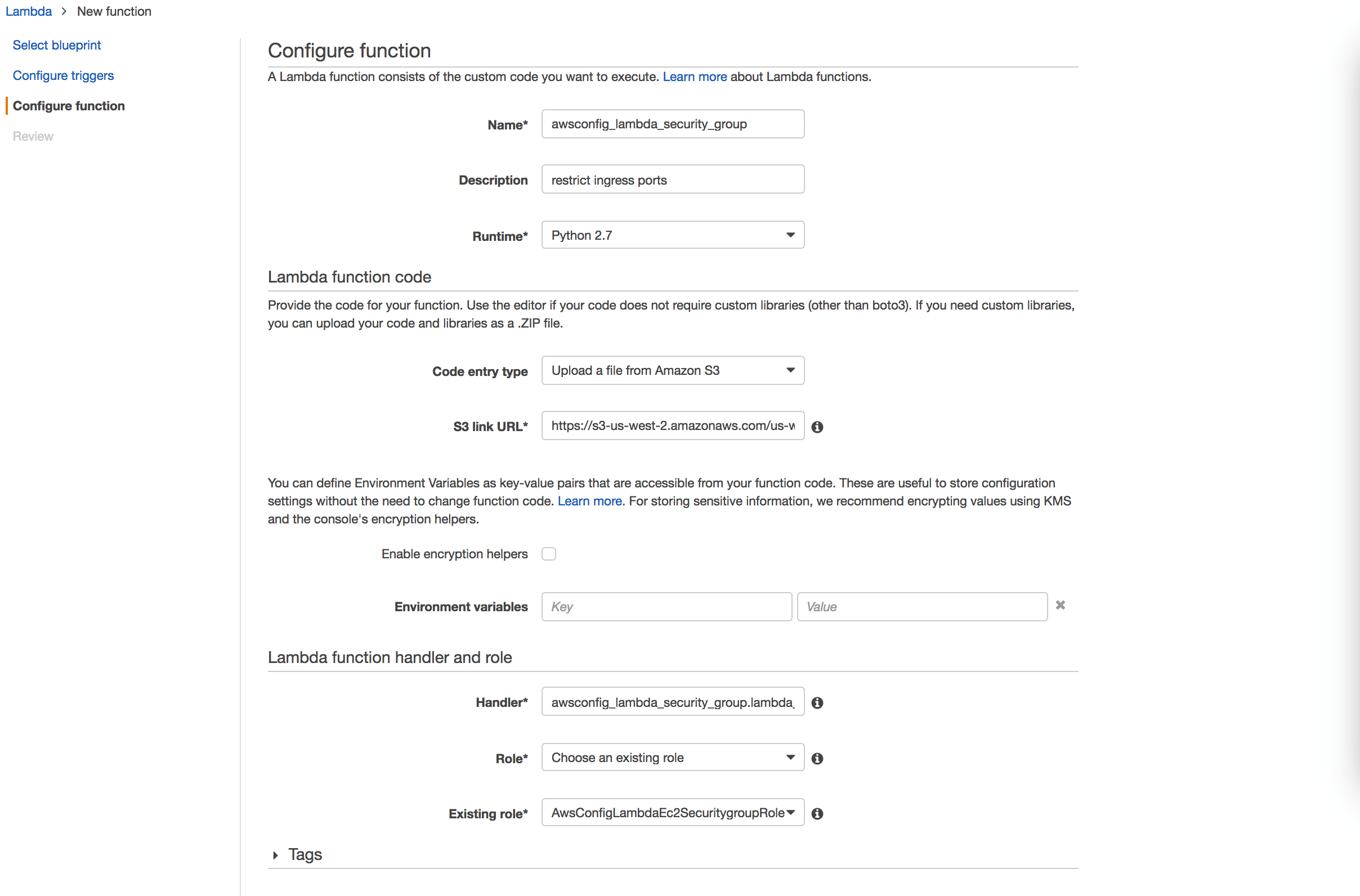 在lambda创建过程中,选择blank blueprint 并为函数指定runtime为python2.7 ,将准备好的代码保存在s3(可以在github中找到相关代码参考,比如https://github.com/awslabs/aws-config-rules )并上传。