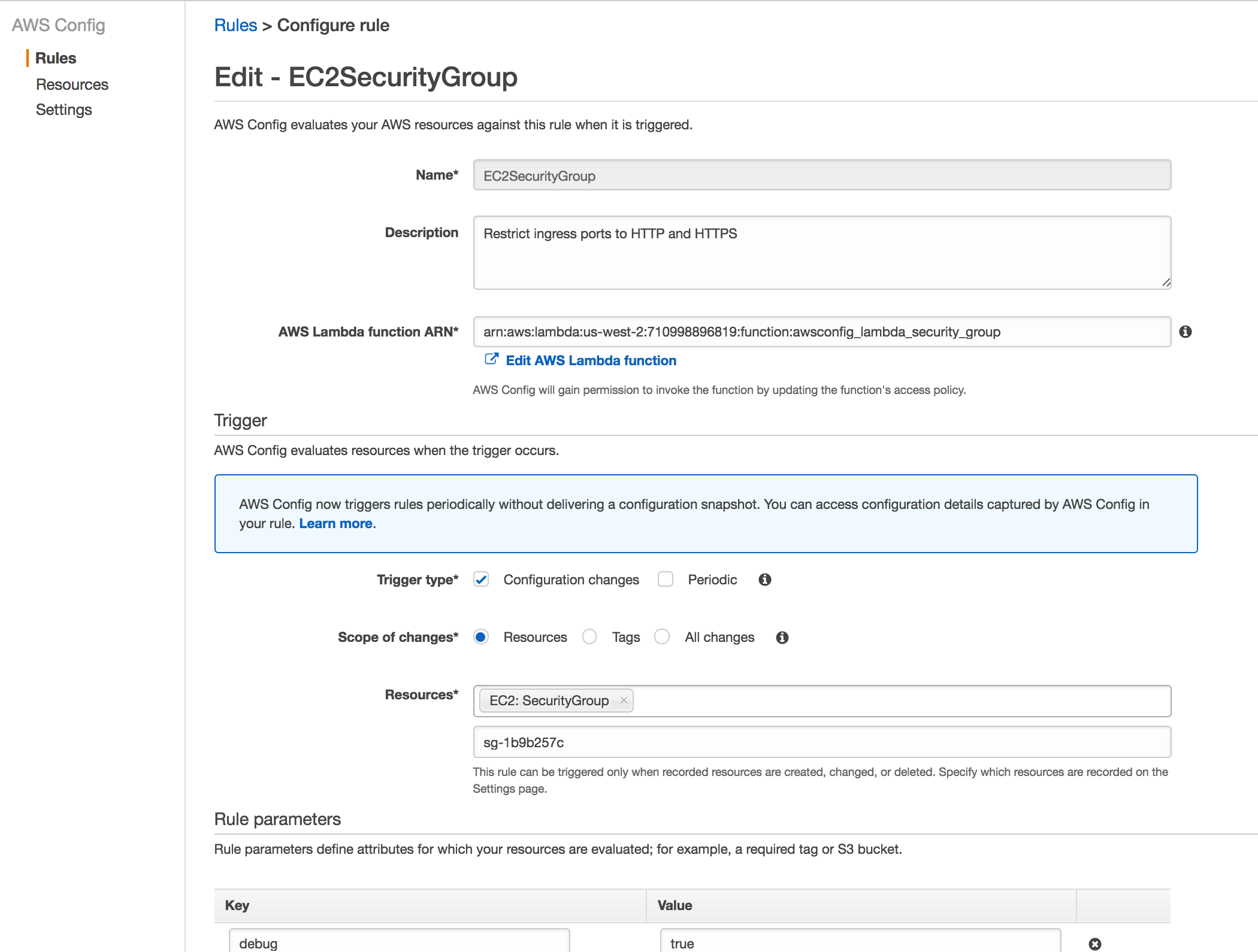 lambda创建完成后,需要在AWS Config 规则页面中指定Lambda ARN,  配置触发器。本例中,当安全组配置发生变化时即触发对安全组的评估,也可以配置按照时间周期的评估对象。 另外,为了详细记录评估信息,为规则启用debug级别的记录。