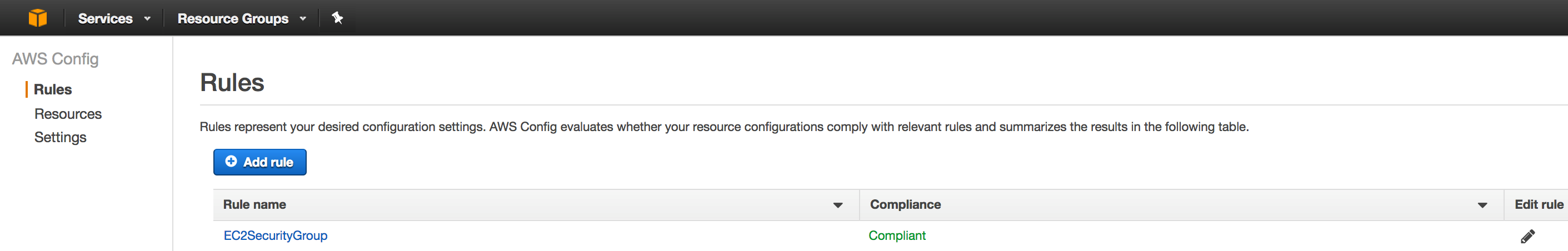 AWS config  规则后,当前的安全组配置将自动被评估。