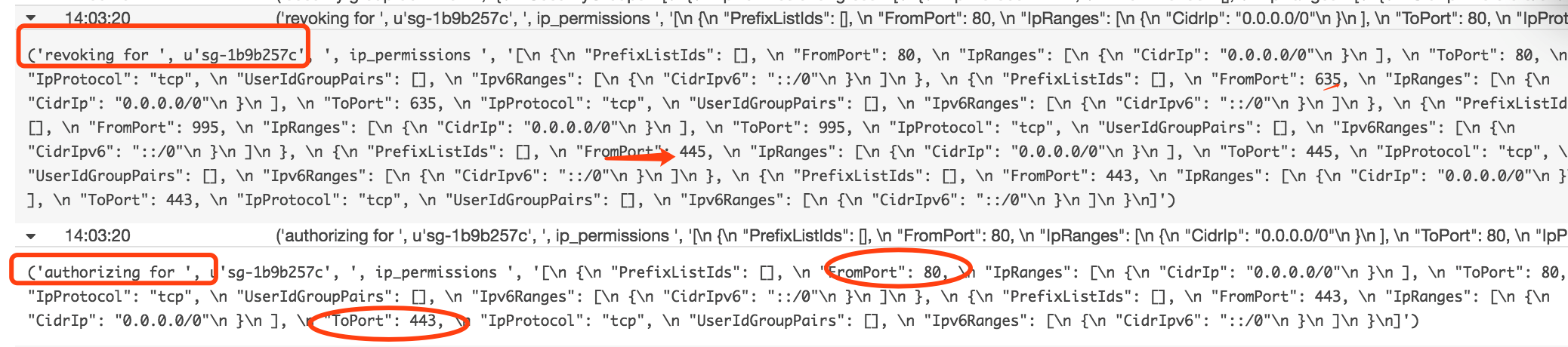 在日志中可以清楚看到对安全组有revoking的行为,操作的端口正是额外添加的tcp445 , 并且最终将安全组只开启tcp80 和tcp443 端口。